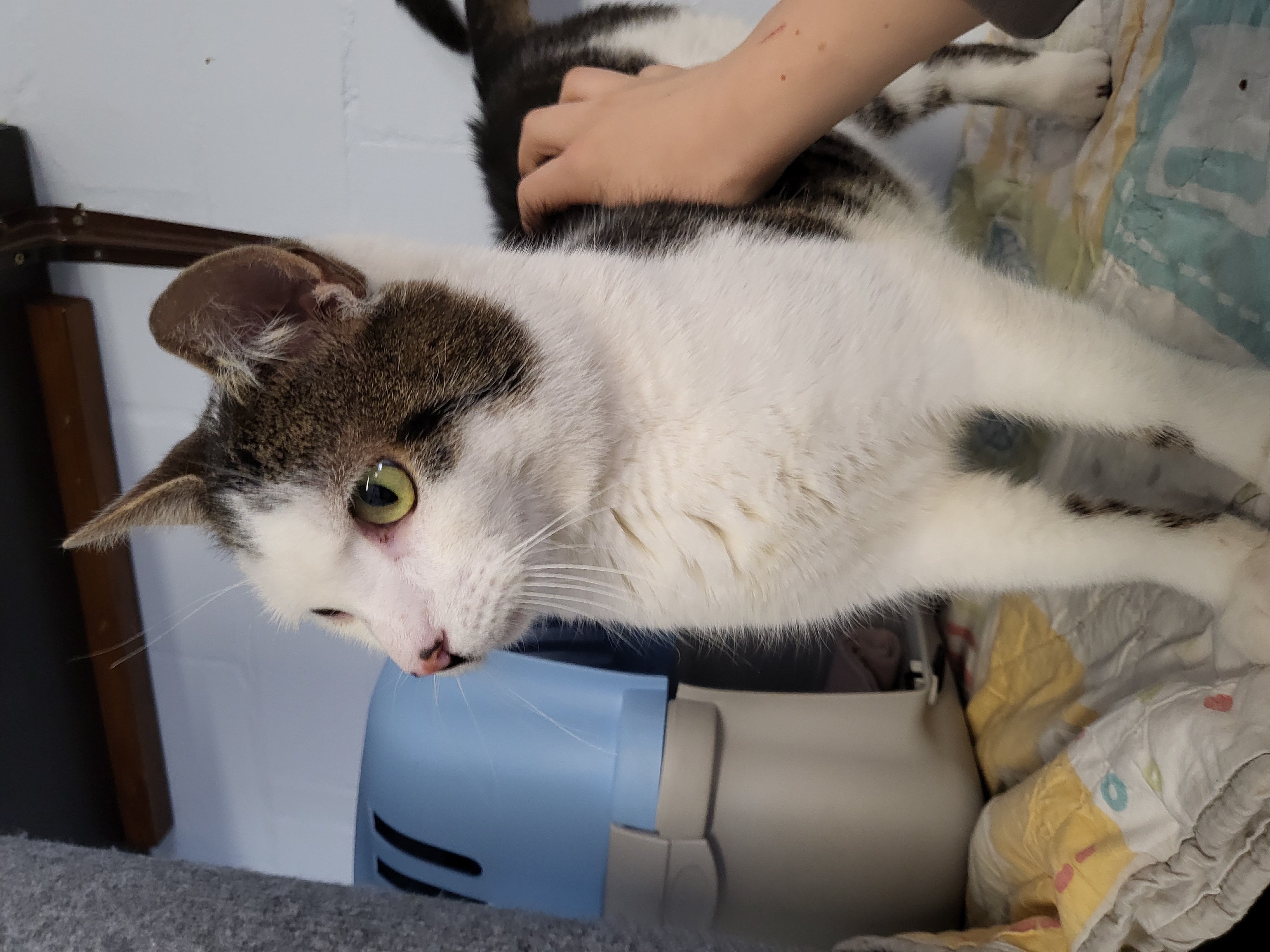 Jenno kam mit zwei anderen Katzen zu uns, weil sie ihre bisherige Versorgung an einer Futterstelle verloren haben. Jenno ist als erster aufgetaut und hat schnell angefangen, mit uns zu kuscheln. Inzwischen ist er ein richtiger Schmusebär und gibt sogar Köpfchen. Bei Fremden braucht er einen kurzen Moment, um Vertrauen aufzubauen. Wenn man ein paar Leckerchen dabei hat, steht man bei Jenno direkt gut dar, denn der süße Kater ist sehr verfressen.