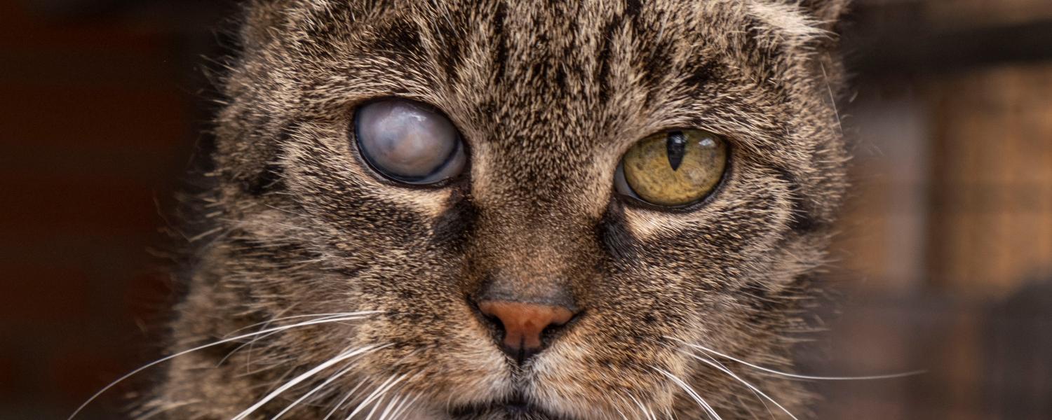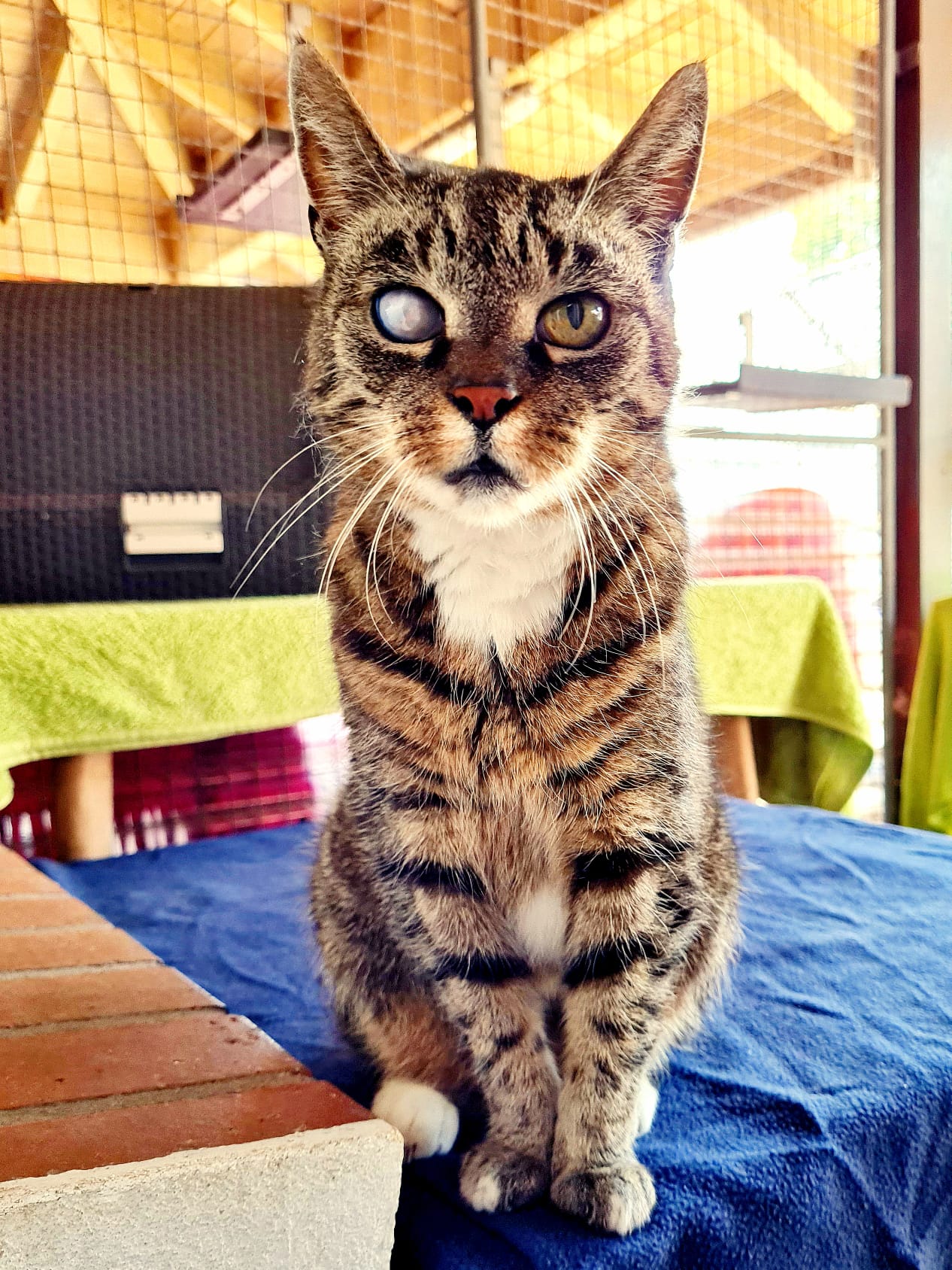 Pringles hat lange draußen gelebt und wurde sporadisch von Anwohnern versorgt. Als auf einmal ihr Auge trüb wurde, hat sie jemand zu uns gebracht. Vermutlich sieht sie aufgrund einer alten Hornhautverletzung auf dem rechten Auge nur noch Schatten. Man kann dies nicht mehr behandeln und sie hat keine Schmerzen.